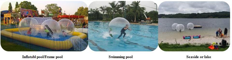 The water walking ball can play in inflatable pool, swimming pool, small lake, etc.